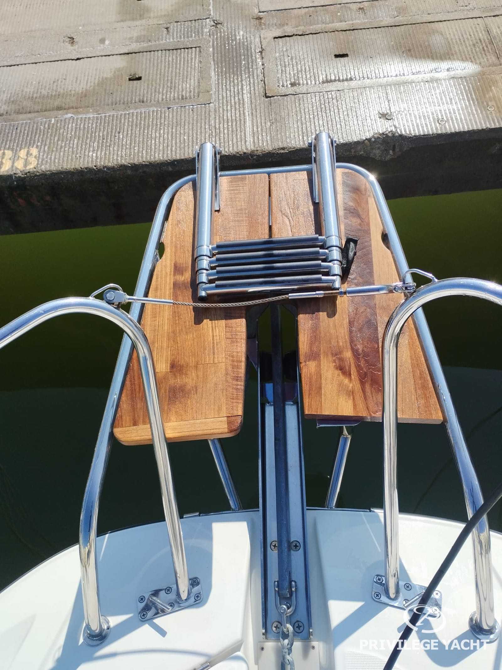 En cubierta, destaca su amplia plataforma de baño, ducha de cockpit, mesa exterior, solárium de proa, cojines de cockpit, bimini top y cabriolet, además de flaps y ancla