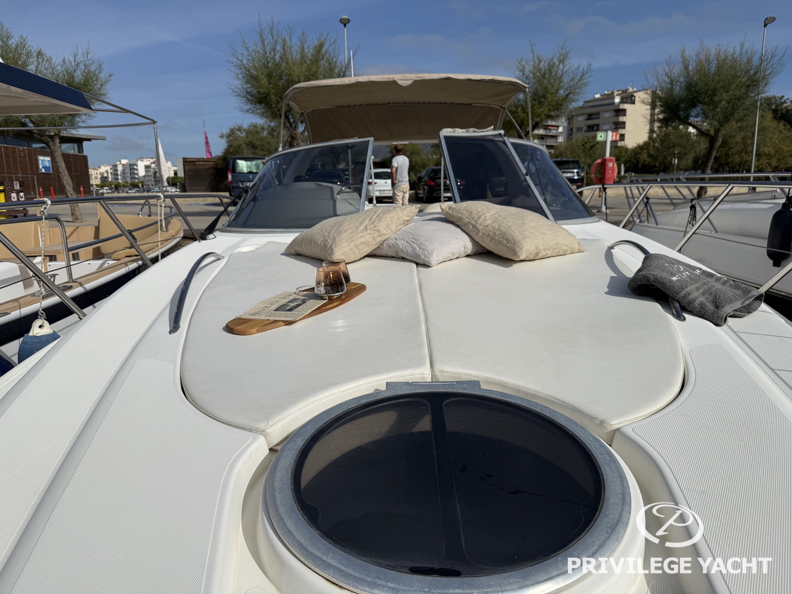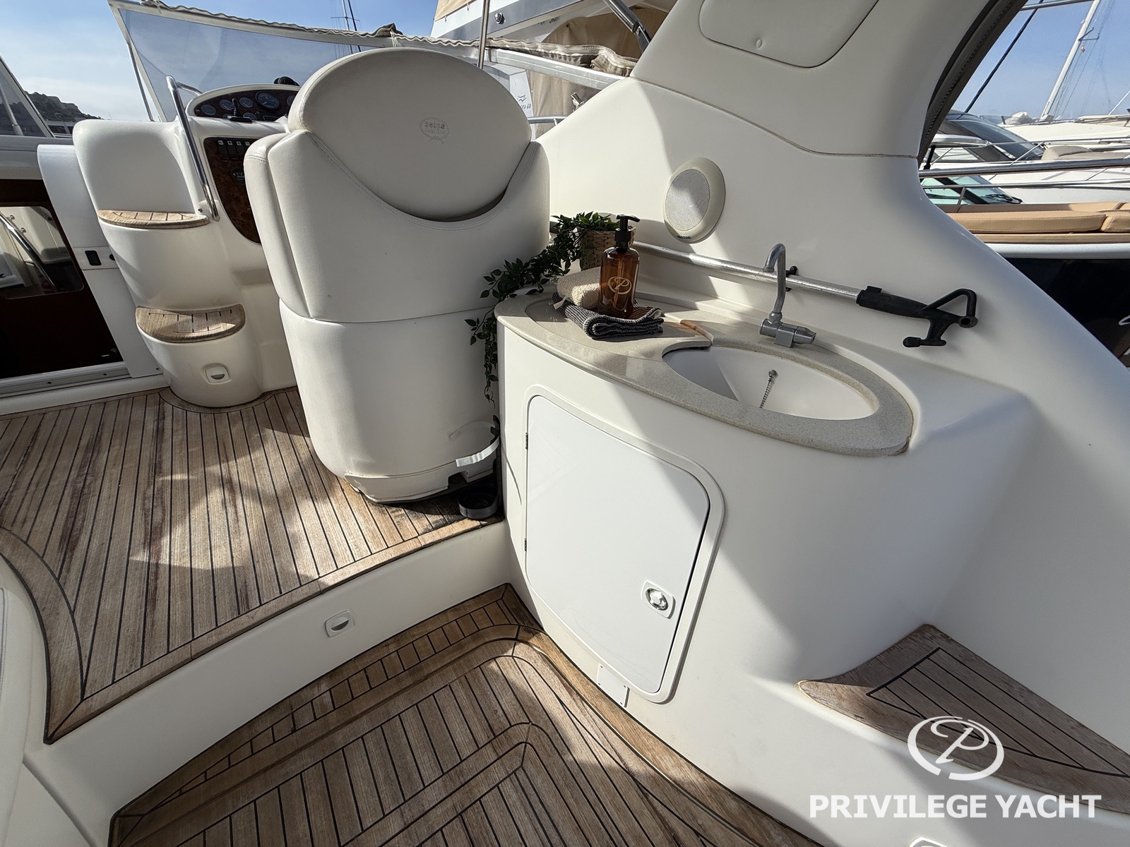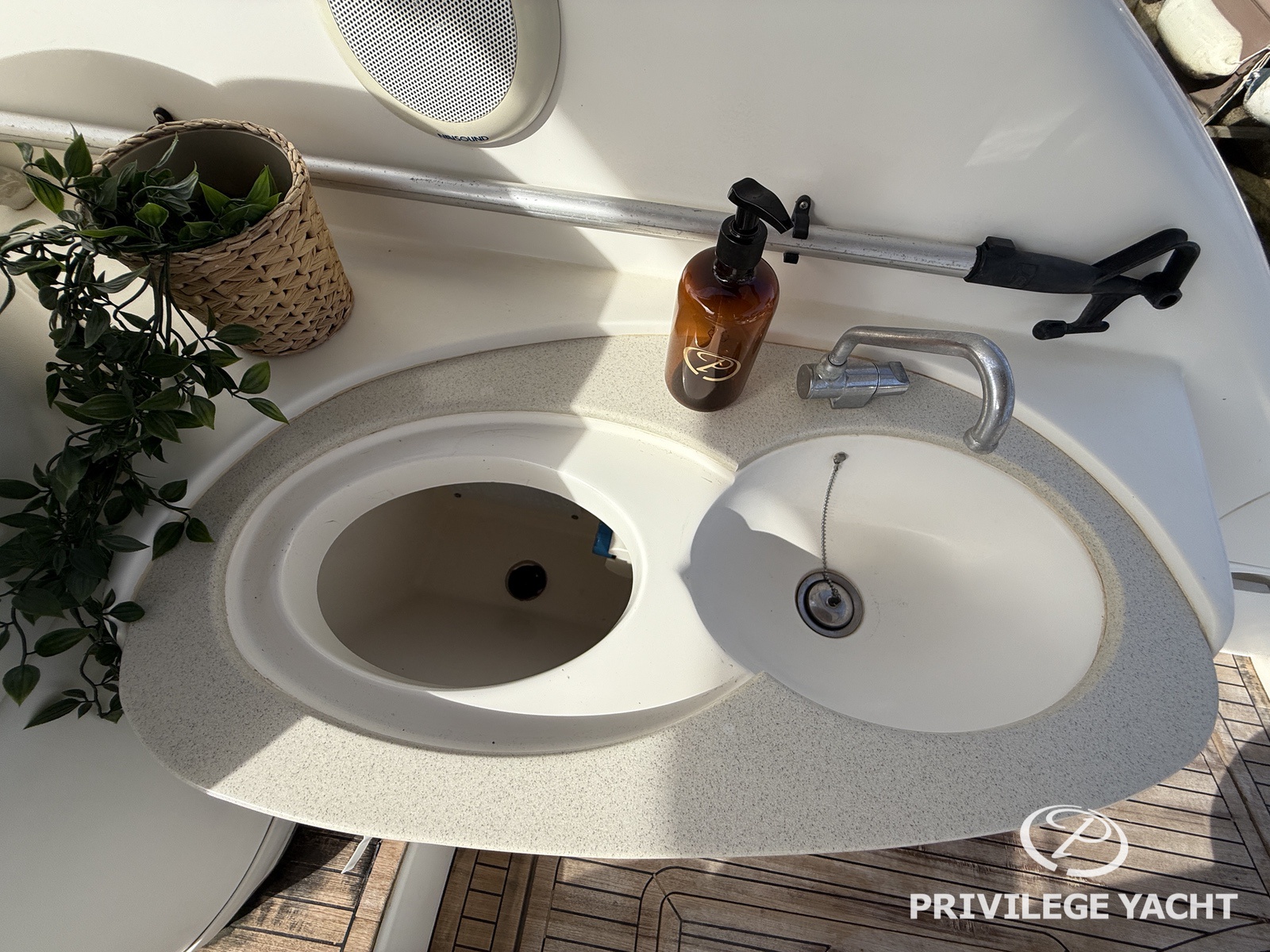 En cubierta, el yate ofrece una amplia zona de solárium en proa, una generosa plataforma de baño en popa y un cómodo cockpit con asientos acolchados y espacio de comedor, perfecto para disfrutar de la vida al aire libre.