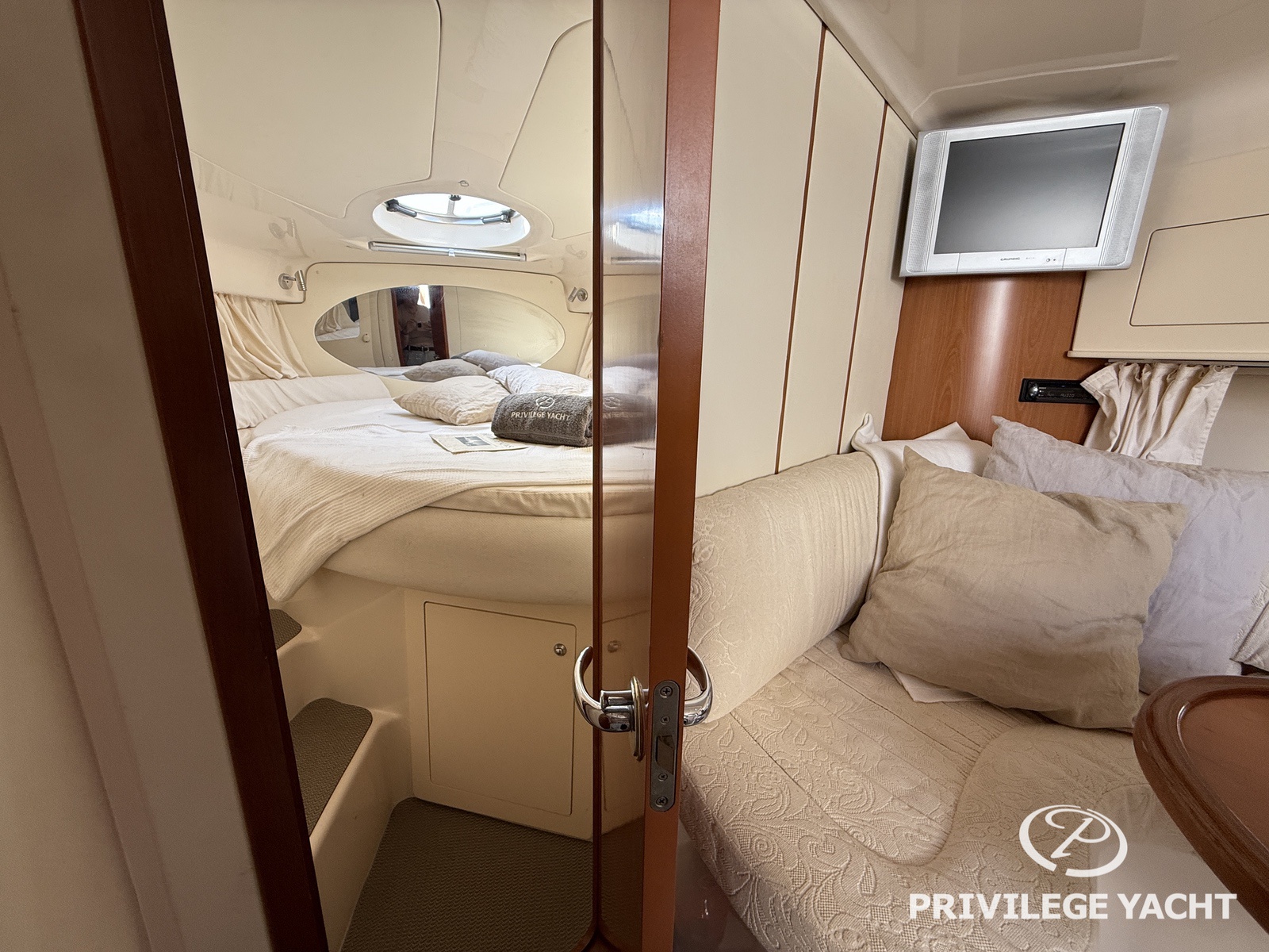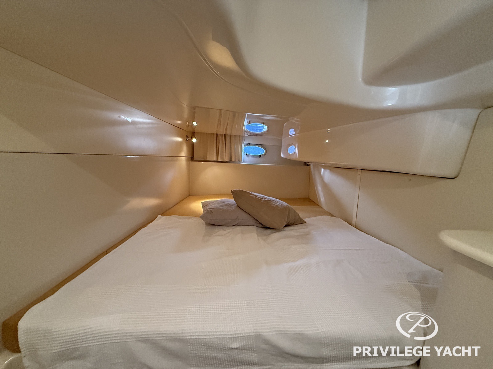 En el interior, el ambiente es luminoso y acogedor, realzado por acabados en madera de calidad y detalles cuidadosamente pensados. La distribución incluye un salón convertible, una cocina totalmente equipada y dos cabinas confortables: una cabina principal en proa con cama doble y una cabina de invitados en popa. Un baño práctico con WC marino, lavabo y ducha completa el interior.