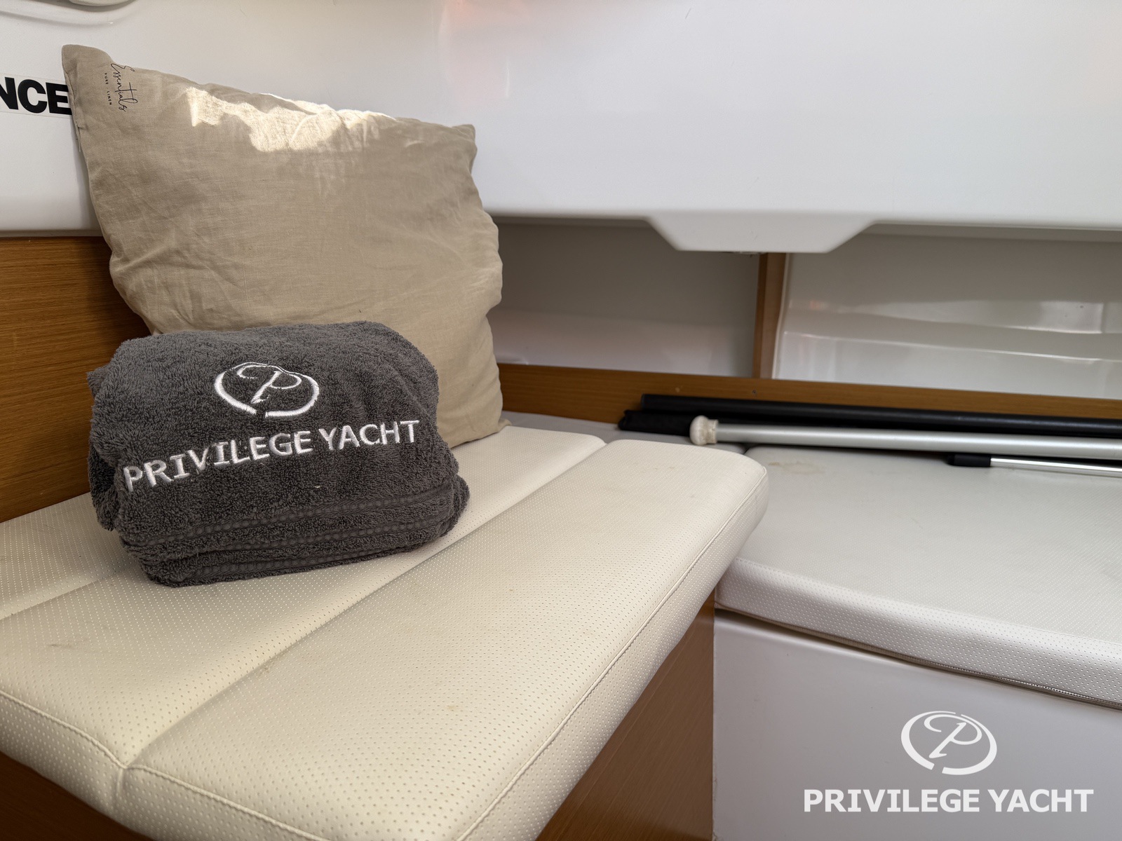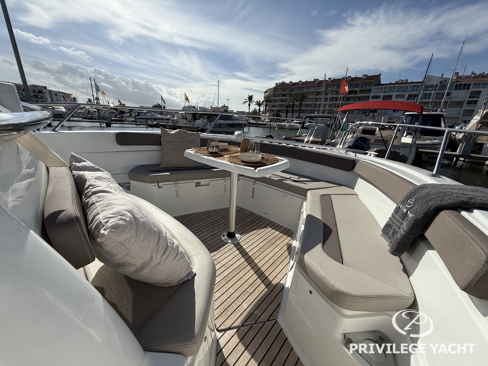Forward, a spacious and multifunctional area includes V-shaped benches with comfortable backrests that easily convert into a large sundeck, ideal for relaxing, sunbathing, or enjoying a drink at anchor. The aft cockpit offers generous seating with fold-down benches, a removable table, and direct access to the swim platforms, creating an ideal space for socializing or water sports.