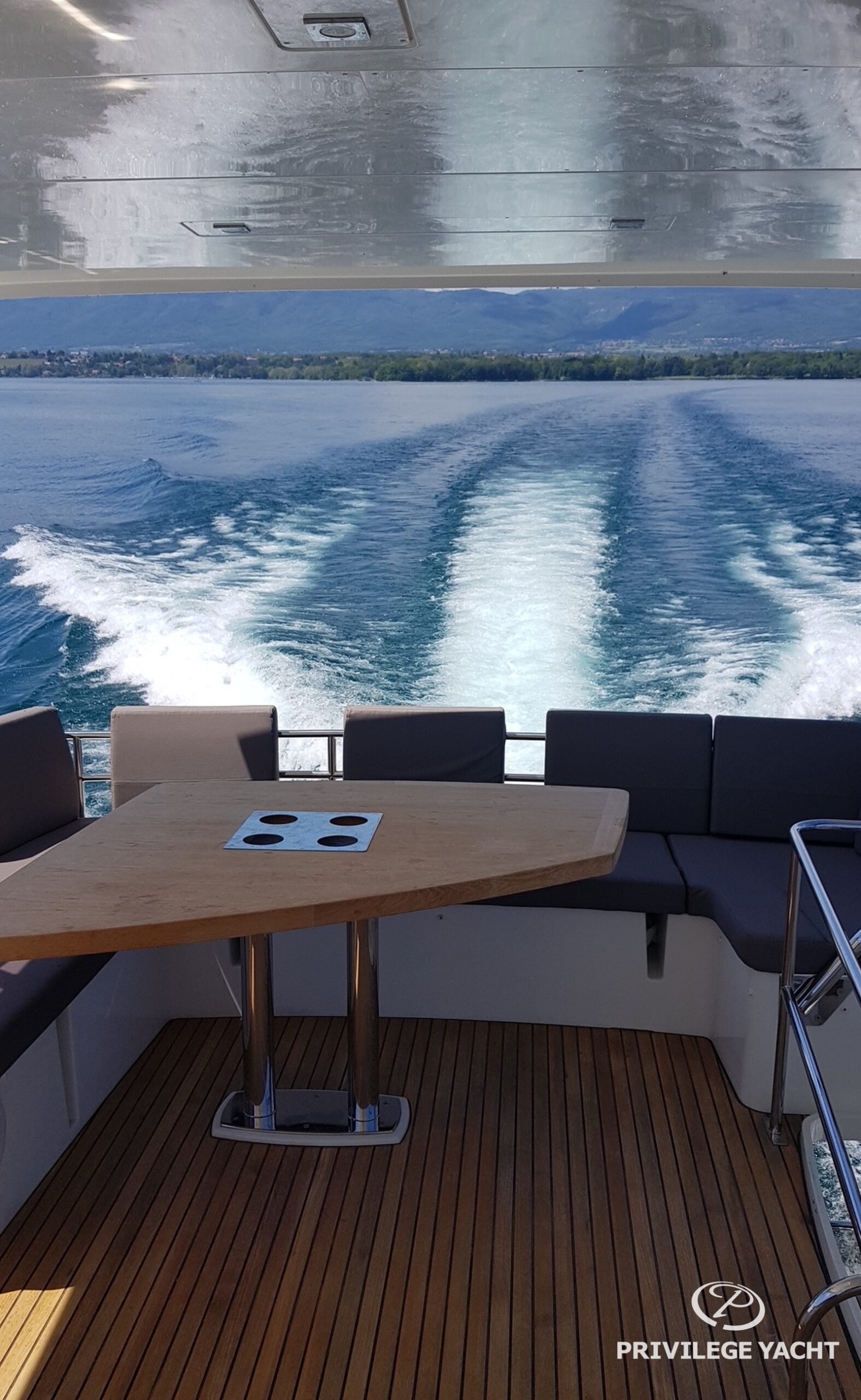 With an overall length of 17.92 meters and a beam of 4.79 meters, the Prestige 550 offers generous interior and exterior spaces. The layout features three beautifully appointed cabins and two bathrooms, along with a separate crew cabin, comfortably accommodating up to seven guests. The interior combines refined materials, warm tones, and ample natural light, creating a luxurious yet inviting atmosphere.